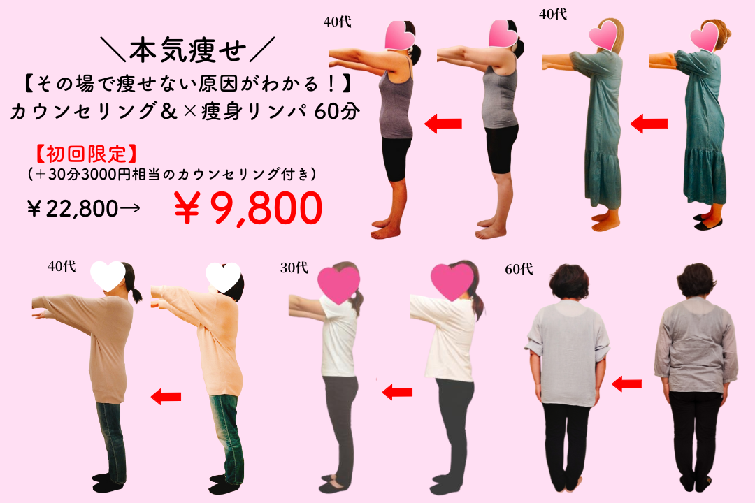 【初回限定】痩せない原因がその場で分かるカウンセリング(※30分3,000円相当)&オールハンドリンパトリートメント60分が期間限定でお得に!